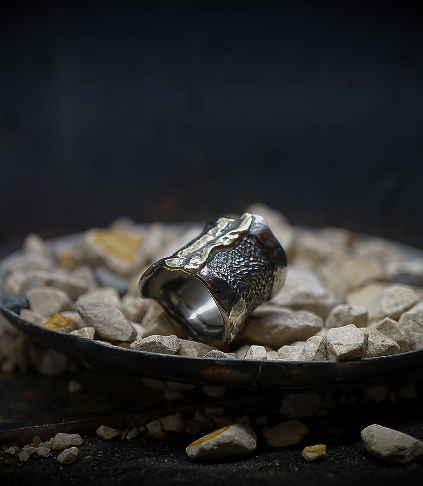Cette bague en or argent massif est un véritable bijou de caractère, qui se distingue par son design unique.