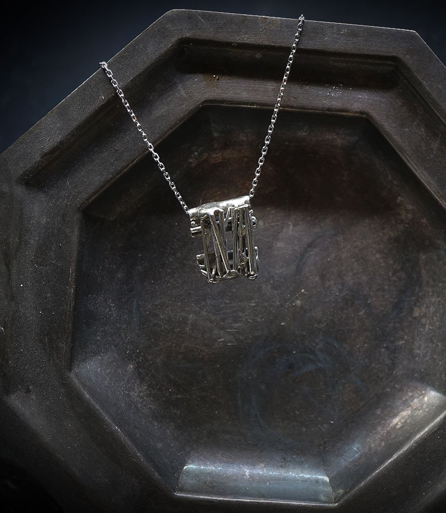 Des pendentifs de la collection Krazy Stones peuvent évoquer la tectoniques des plaques, avec la superposition de différentes pièces d'argent 925/1000 donnant un style géométriques mais asymétriques.