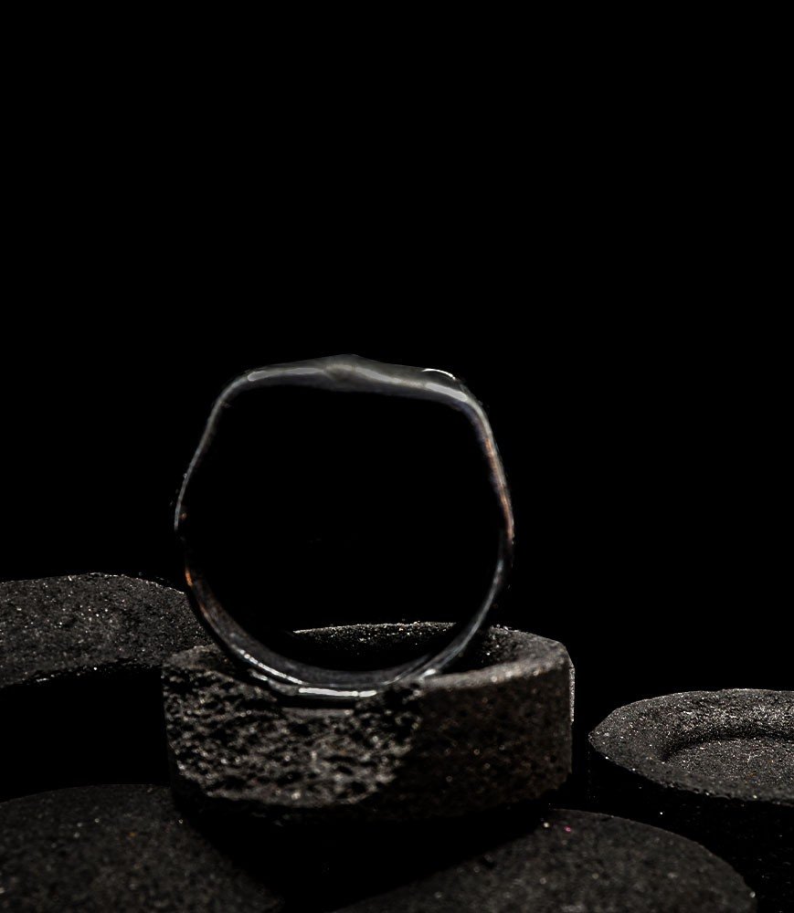 Au départ de mes réalisations j'étire le métal pour former une plaque ovale, puis je plis les deux côtés pour façonner les bords, enfin je cintre la bande obtenue pour faire un anneau.