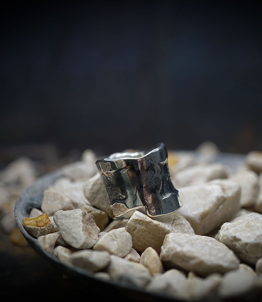Valentine pour cette collection de bagues utilise une seule pièce d'argent au titre légal 925/1000 par création, qu'elle associe parfois à de la "côte de maille" en argent 925/1000. elle peut aussi sertir des pierres fines ou précieuses sur certaines pièces, en repliant simplement les bords de la bague sur le minéral.