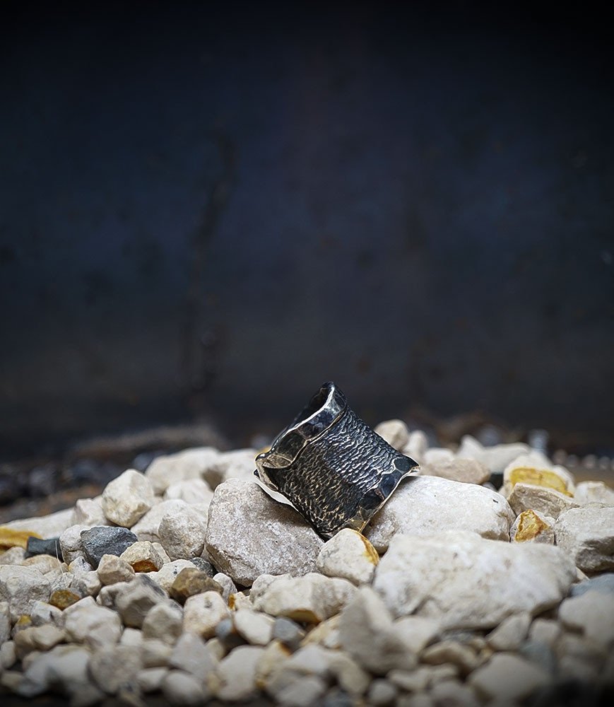 Valentine pour cette collection de bagues utilise une seule pièce d'argent au titre légal 925/1000 par création, qu'elle associe parfois à de la "côte de maille" en argent 925/1000. elle peut aussi sertir des pierres fines ou précieuses sur certaines pièces, en repliant simplement les bords de la bague sur le minéral.