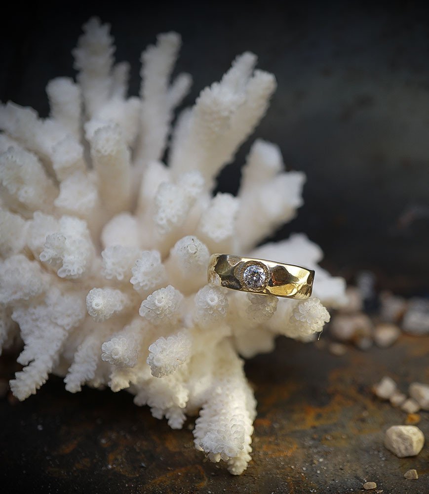 Chaque détail de cette bague, de la texture martelée à l'éclat du diamant, témoigne du savoir-faire et de la minutie de Valentine.