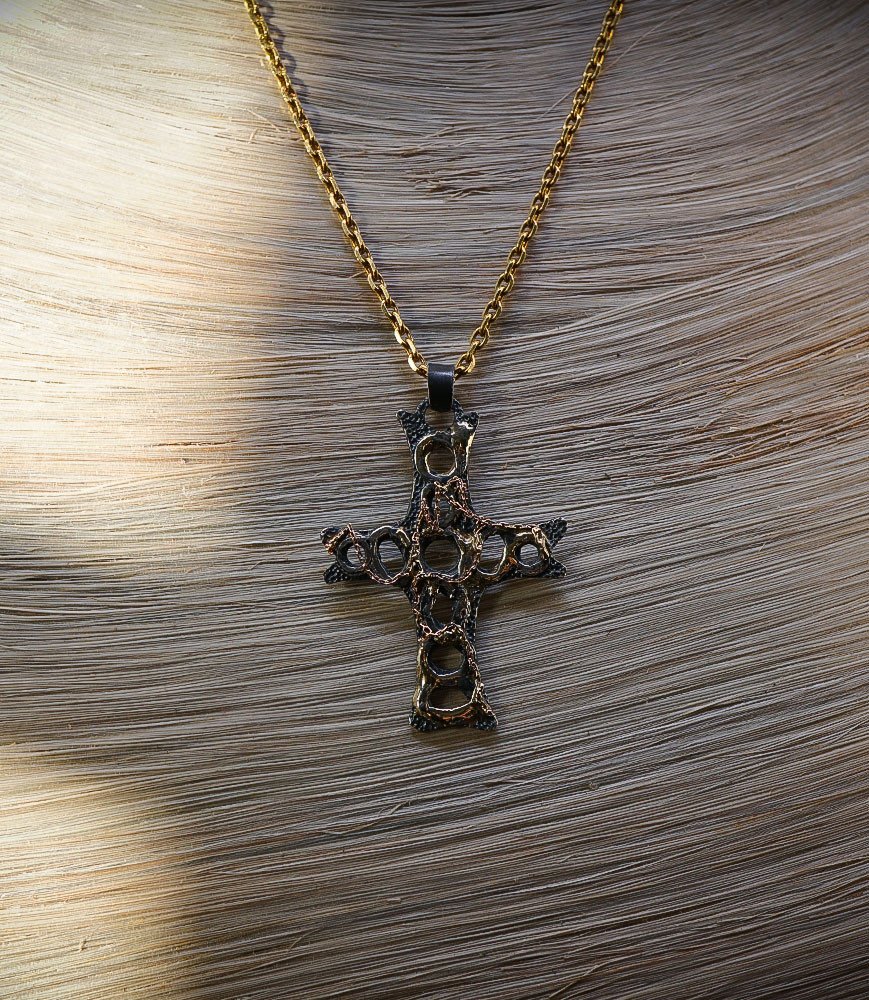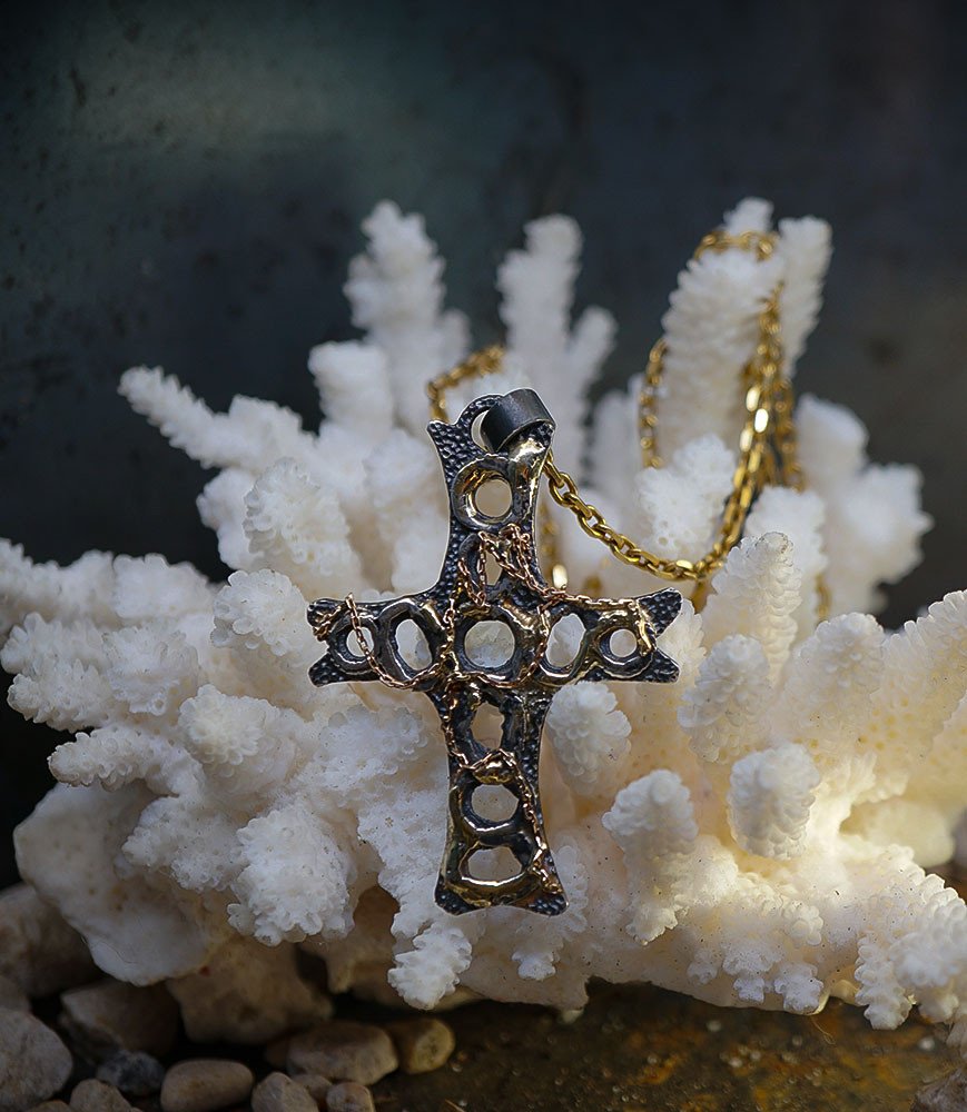 Croix ajourée en or et argent massif, créée par Valantine signée Lovely Storm, est une pièce unique qui allie élégance et originalité.