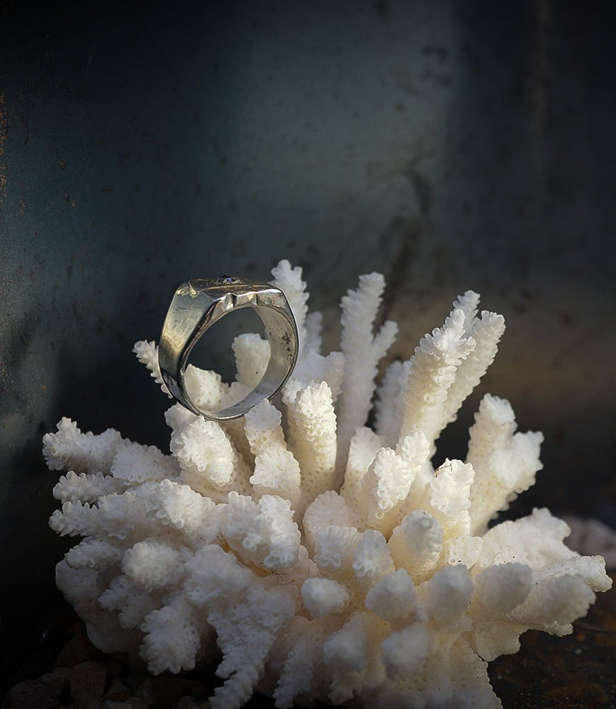 Parfois les stries dans le métal de la bague rappellent la superposition des couches sédimentaires géologiques que l'on peut observer dans les roches.
