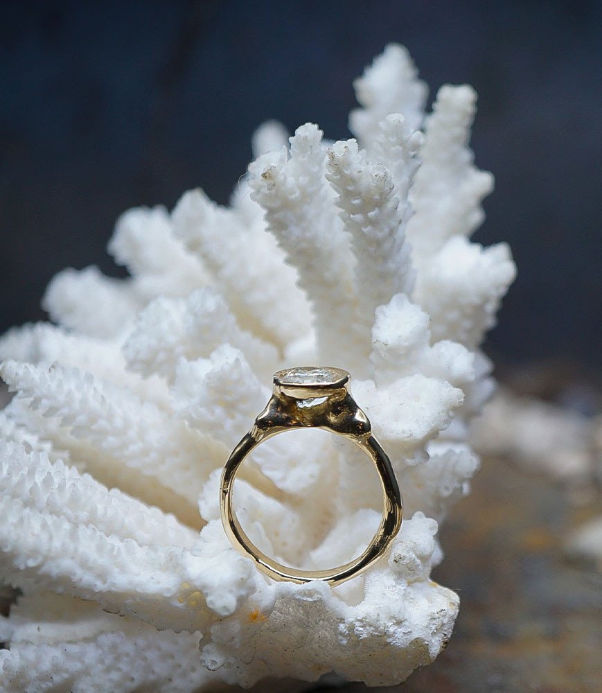 Le solitaire que Valentine a créé, conçue de manière délicate, comme si l'or s'était fondu et formé autour du diamant.