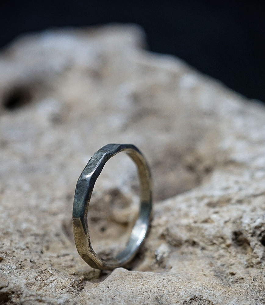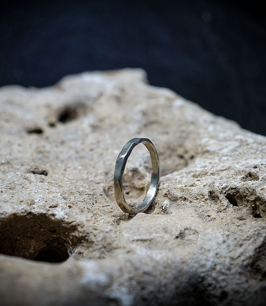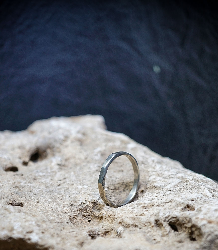 Chaque pièce est travaillée artisanalement par Valentine, donnant naissance à une texture martelée unique, où la lumière accroche subtilement chaque facette irrégulière du métal. Ce jeu de reliefs confère à l’anneau un caractère vivant, à la fois minimaliste et puissant.