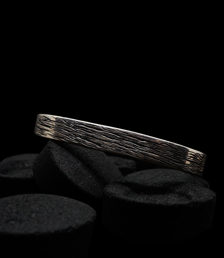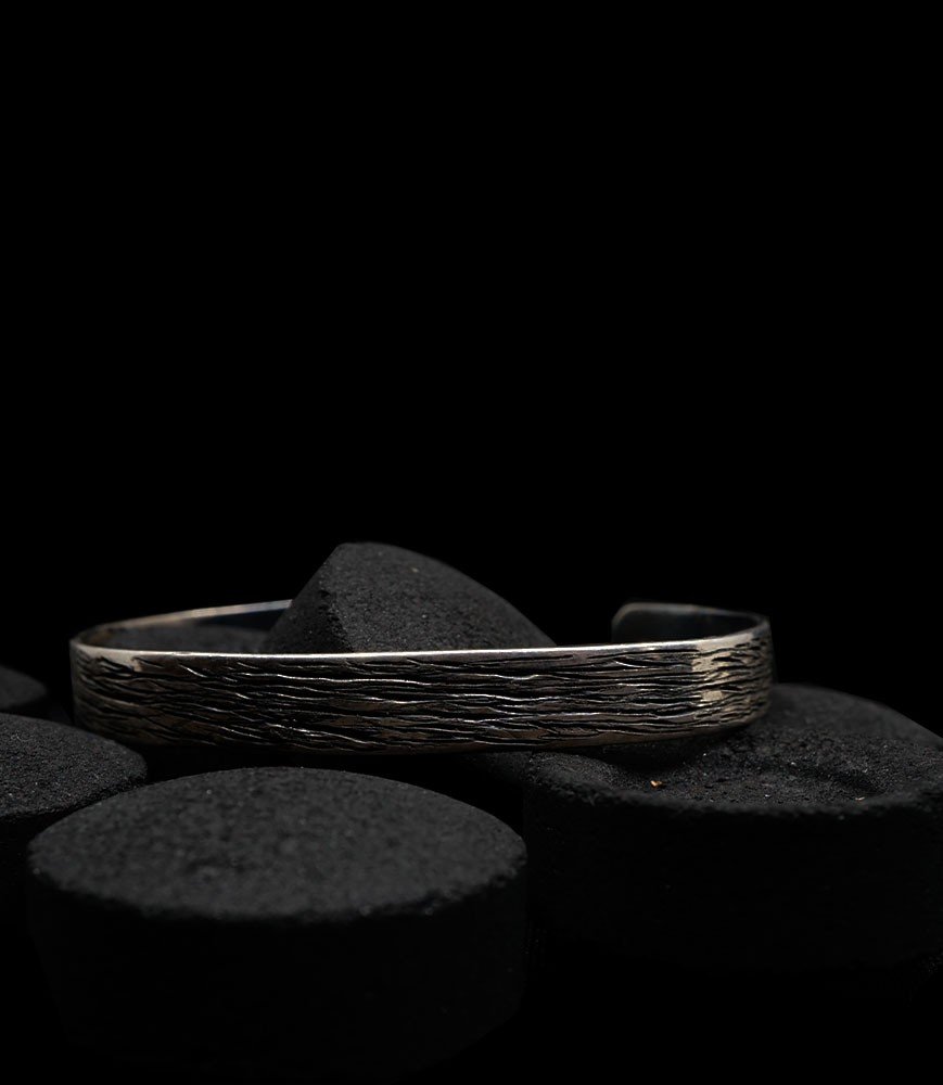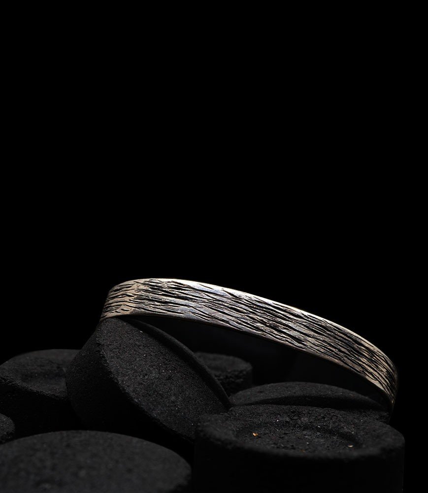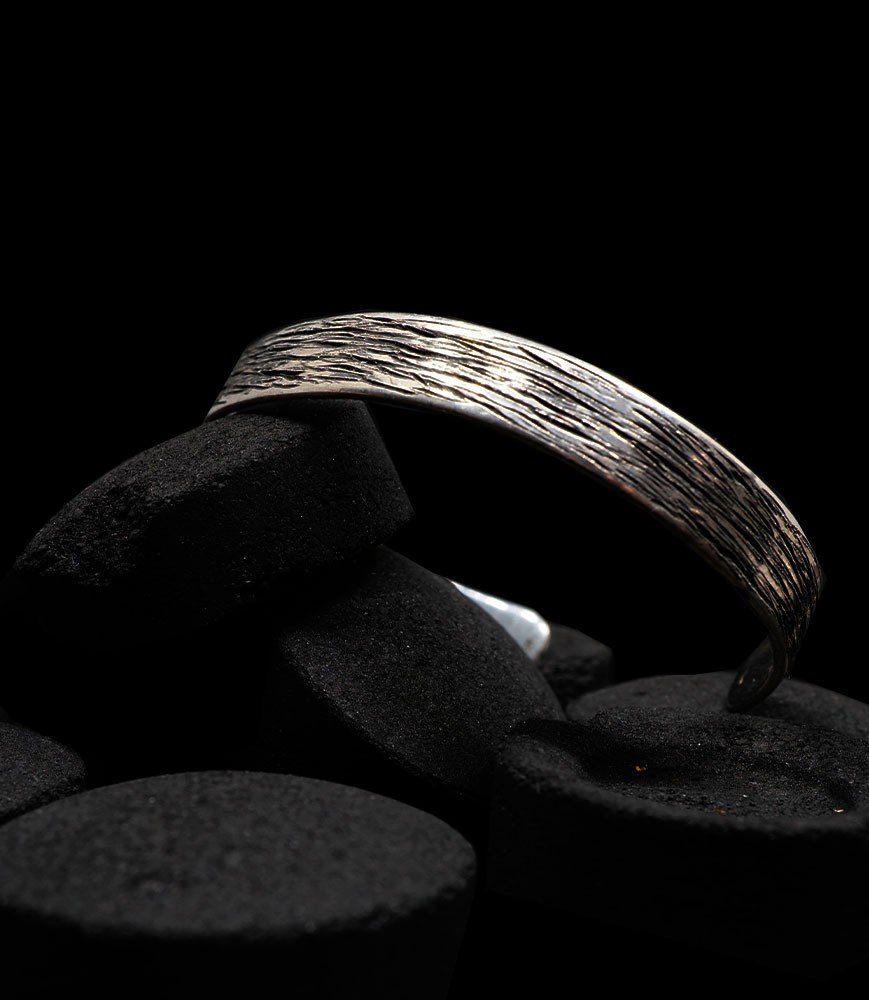 L'argent au titre légal 925/1000 subit un traitement brutal, rude, le résultat après polissage des bagues, bracelets, colliers, bruts, singuliers et harmonieux.