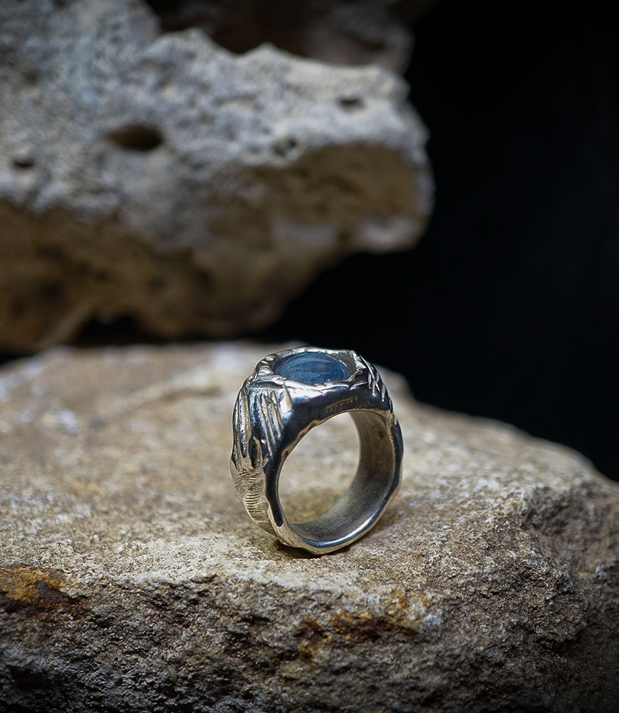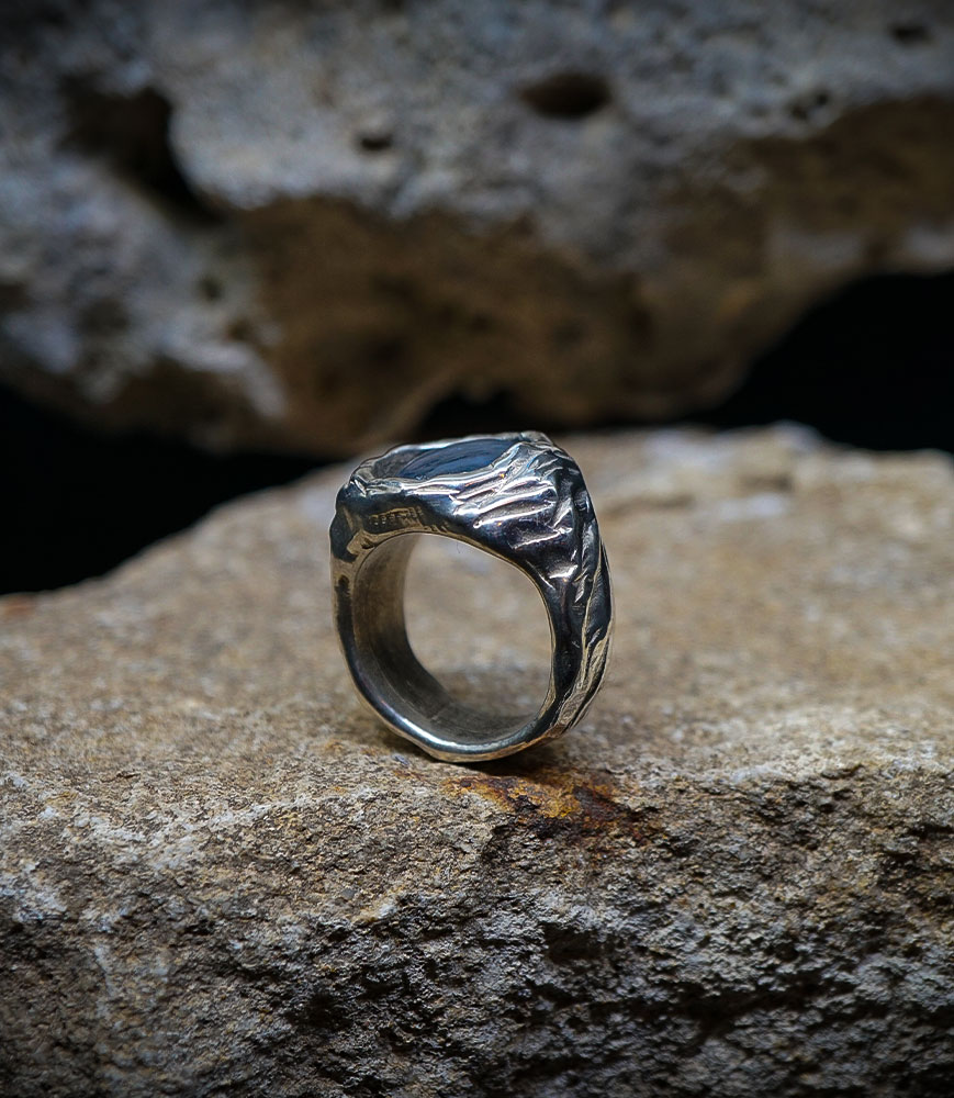 Parfois les stries dans le métal de la bague rappellent la superposition des couches sédimentaires géologiques que l'on peut observer dans les roches. D'autres bijoux en argent 925/1000 et or 750/1000, peuvent se rapprocher du volcanisme et plus précisément l'aspect des roches volcaniques après éruption comme les scories, les métaux semblent avoir fusionnés ou avoir fondus, ou même avoir éclatés, sous l'effet d'une chaleur extrême.