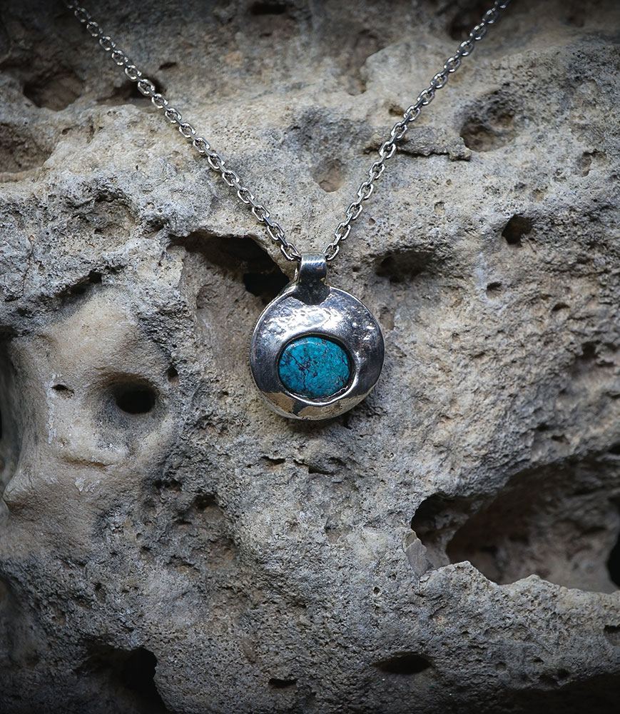 Pendentif en argent brut serti d’une turquoise naturelle, à l’allure authentique et minérale.