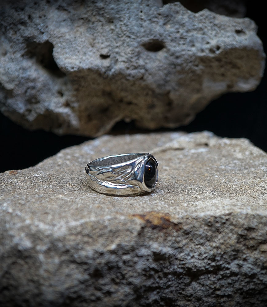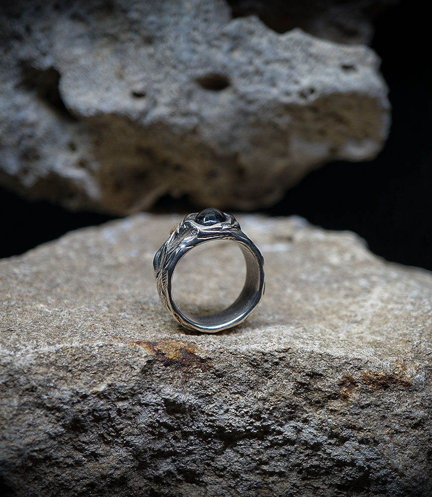 Le travail de la matière : Pour faire écho à la formation de la roche, l’anneau en argent massif a été travaillé pour offrir un relief saisissant. Le jeu des finitions accentue chaque détail :