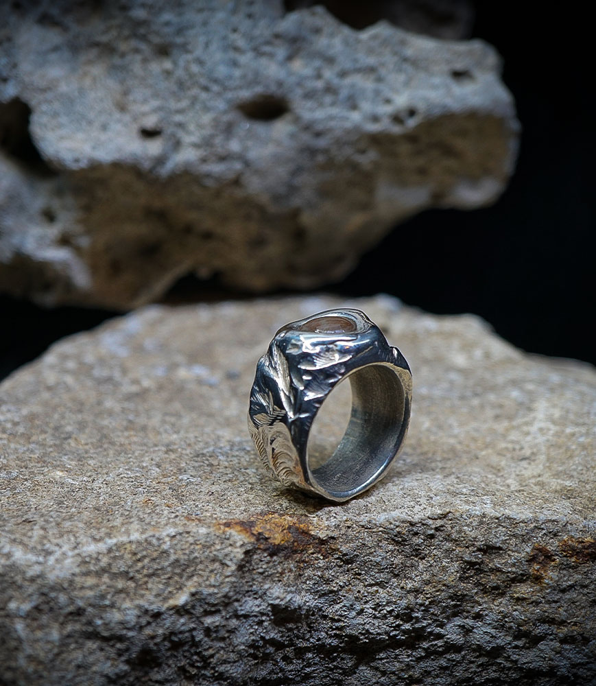 Parfois les stries dans le métal de la bague rappellent la superposition des couches sédimentaires géologiques que l'on peut observer dans les roches. D'autres bijoux en argent 925/1000 et or 750/1000, peuvent se rapprocher du volcanisme et plus précisément l'aspect des roches volcaniques après éruption comme les scories, les métaux semblent avoir fusionnés ou avoir fondus, ou même avoir éclatés, sous l'effet d'une chaleur extrême.