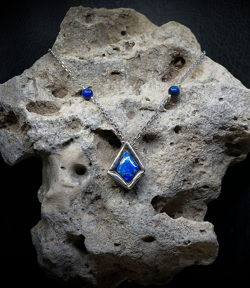 Le mariage de l'éclat lunaire et de la nuit étoilée. Ce collier est une invitation au voyage. La fraîcheur de l'argent s'unit à la profondeur du lapis-lazuli, pierre de sagesse et de sérénité.
