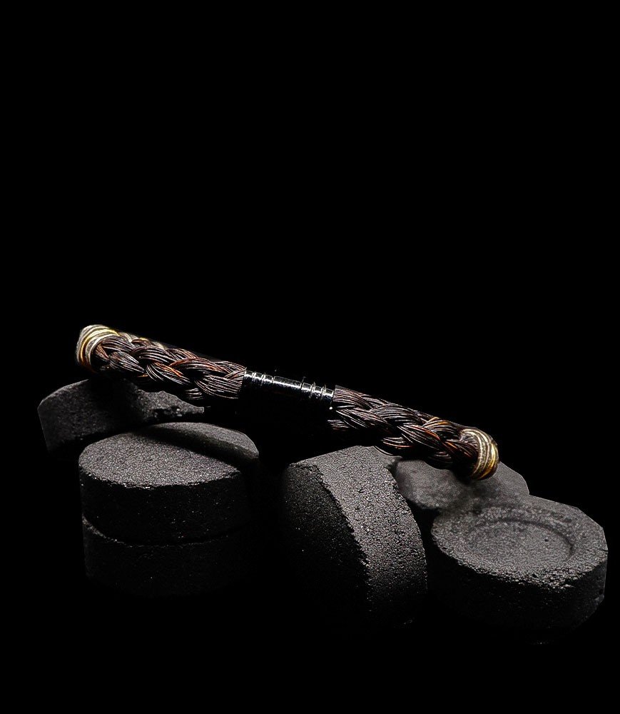 Des fils d'or jaune 750/1000 (1,75 grammes) et d'argent 925/1000 ( 5,75 grammes) s'enroulent autour de cette tresse de crain de cheval , le contraste entre le noir et le jaune de l'or renforce l'élégance et l'originalité de cette pièce unique.