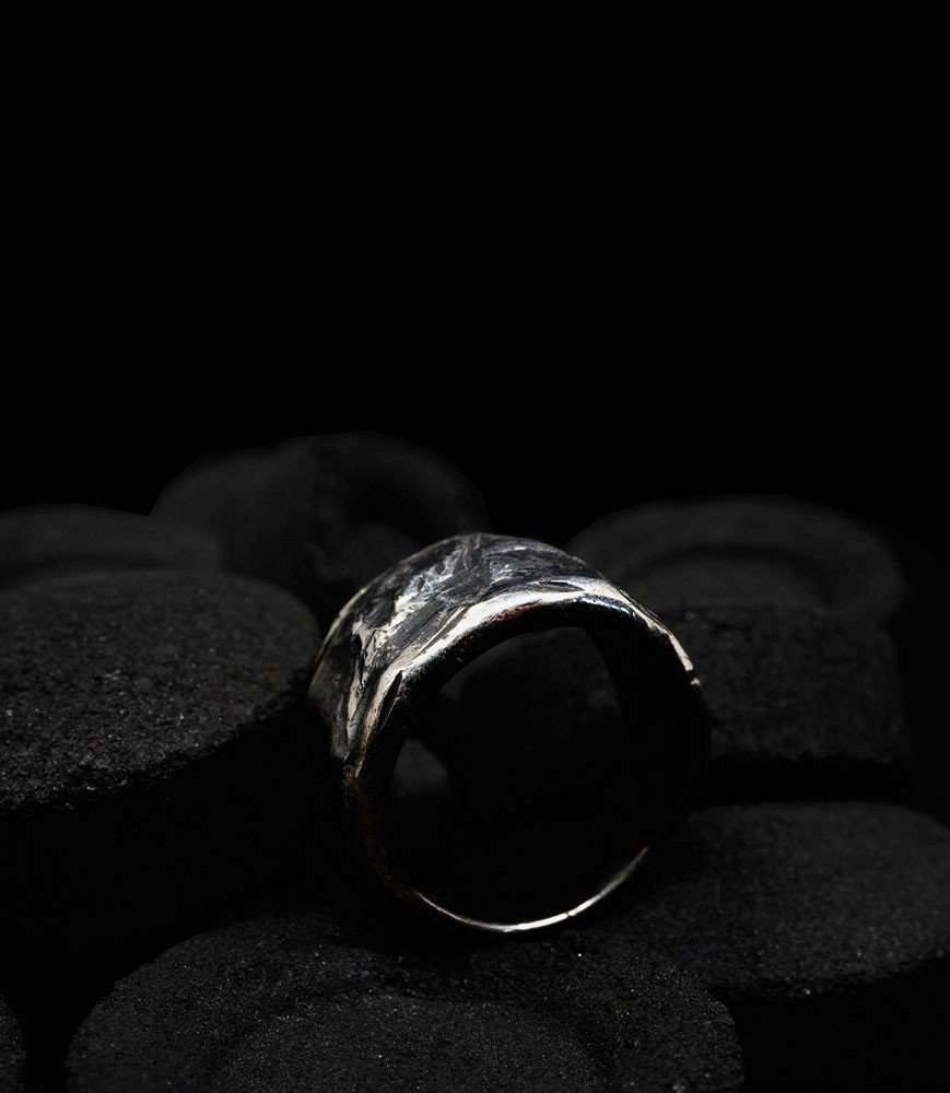 L'argent au titre légal 925/1000 subit un traitement brutal, rude, le résultat après polissage des bagues, bracelets, colliers, bruts, singuliers et harmonieux.