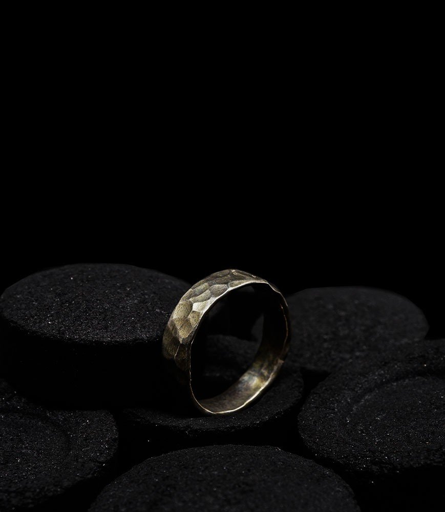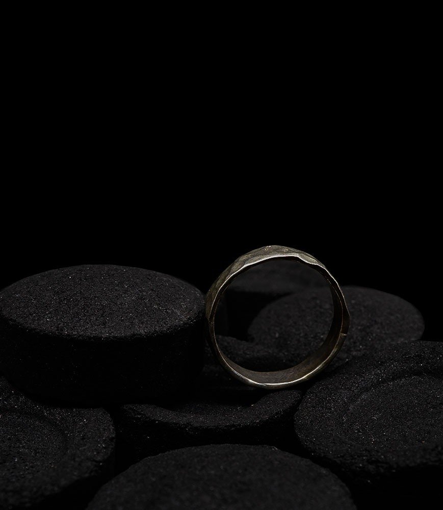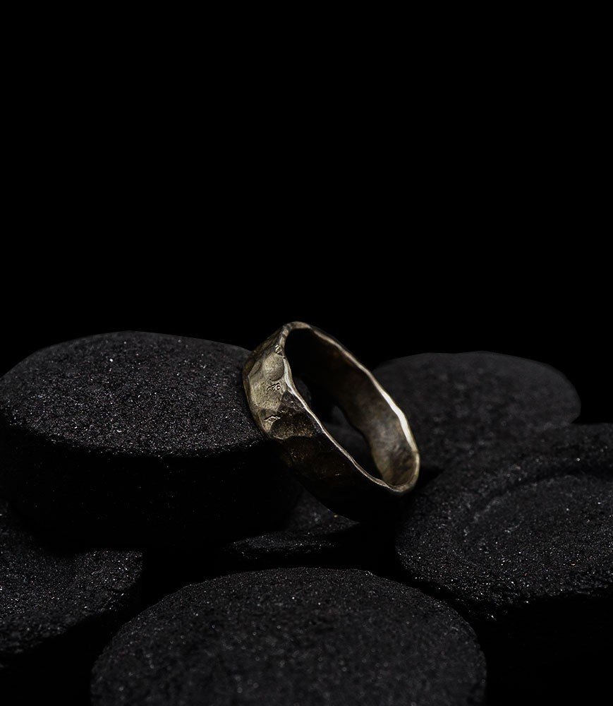Anneau fin, cette pièce mesure 0,7cm, l'argent est patiné, vieilli renforçant l'effet du martelage.