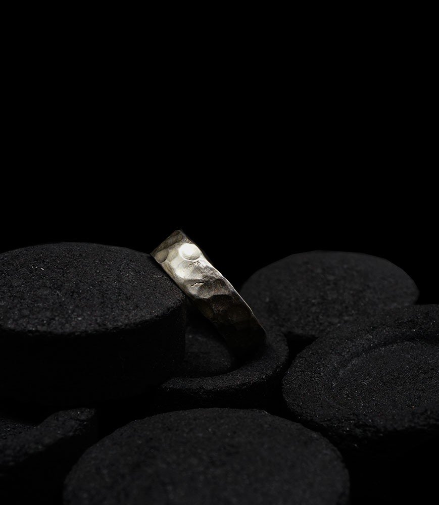 L'argent au titre légal 925/1000 subit un traitement brutal, rude, le résultat après polissage des bagues, bracelets, colliers, bruts, singuliers et harmonieux.