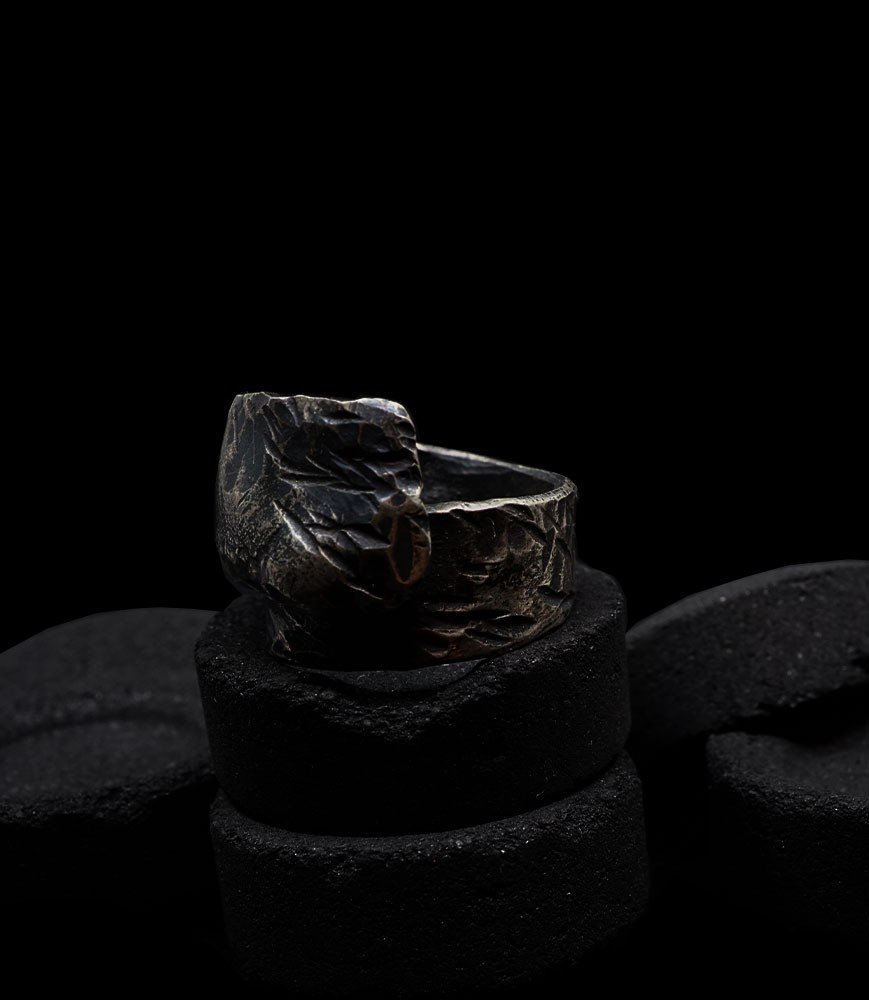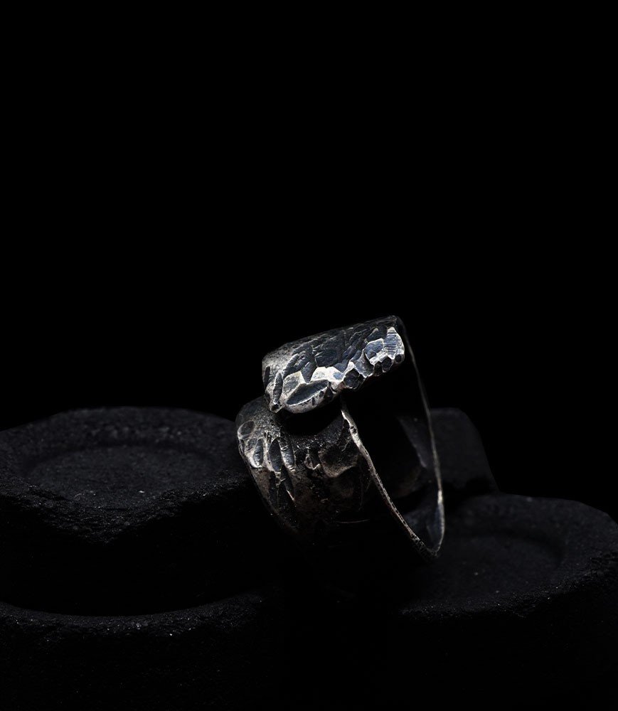 Bague en argent 925/1000 de 22,8 grammes pliée, repliée, martelée, toutes les irrégularités du métal "brutalisé" ressortent et son mises en valeur par la patine foncée appliquée.