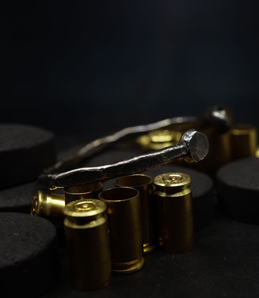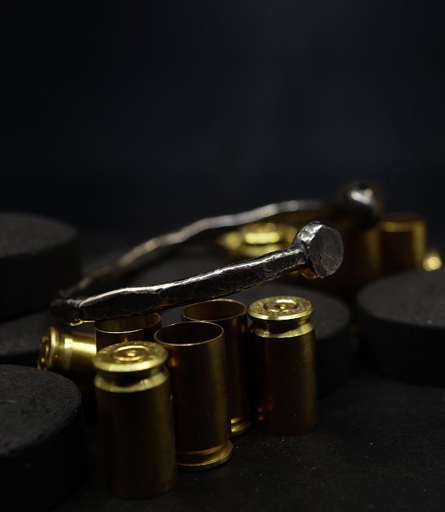 L'argent au titre légal 925/1000 subit un traitement brutal, rude, le résultat après polissage des bagues, bracelets, colliers, bruts, singuliers et harmonieux.