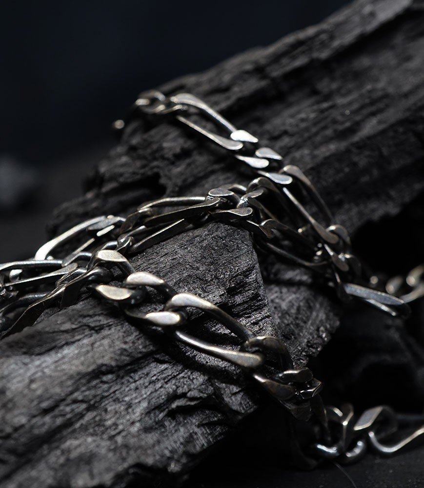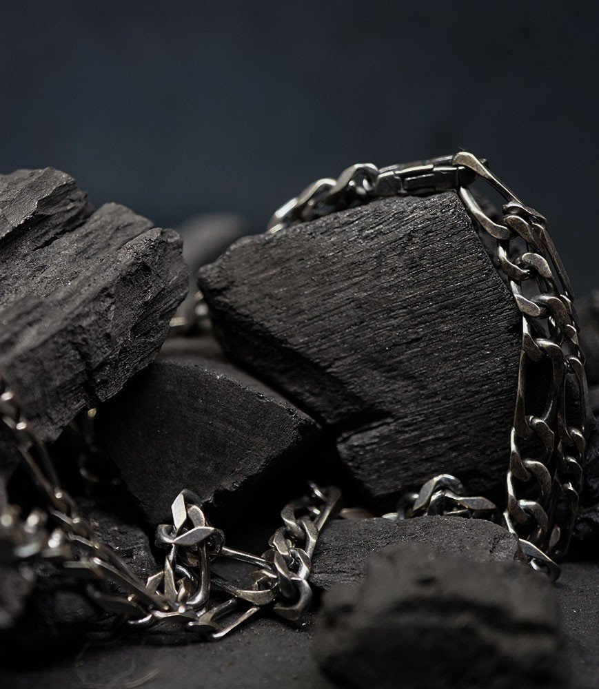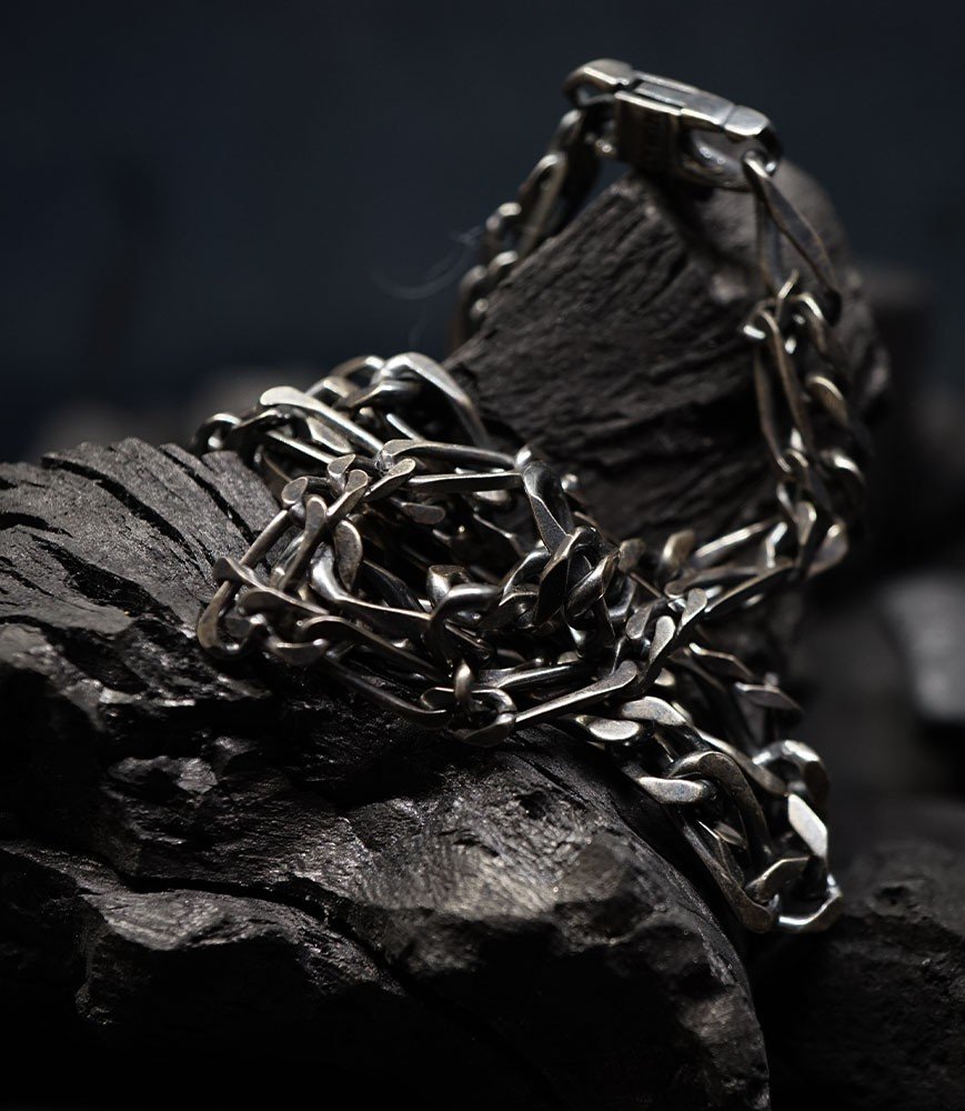 L'argent au titre légal 925/1000 subit un traitement brutal, rude, le résultat après polissage des bagues, bracelets, colliers, bruts, singuliers et harmonieux.