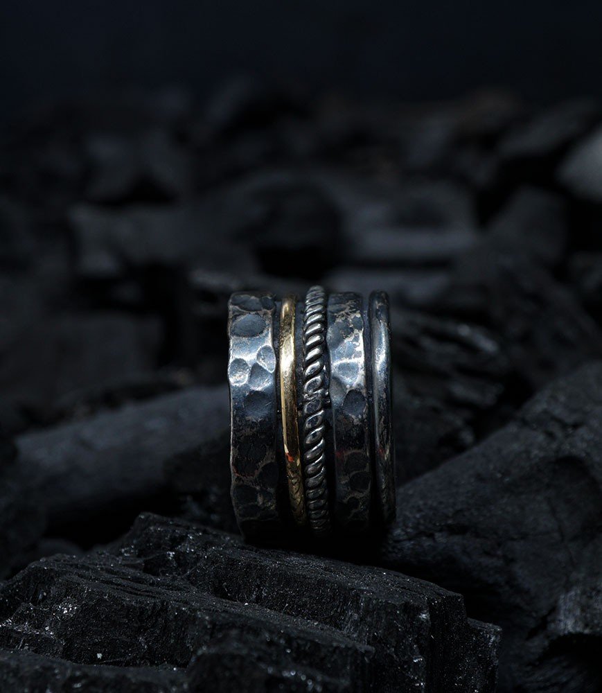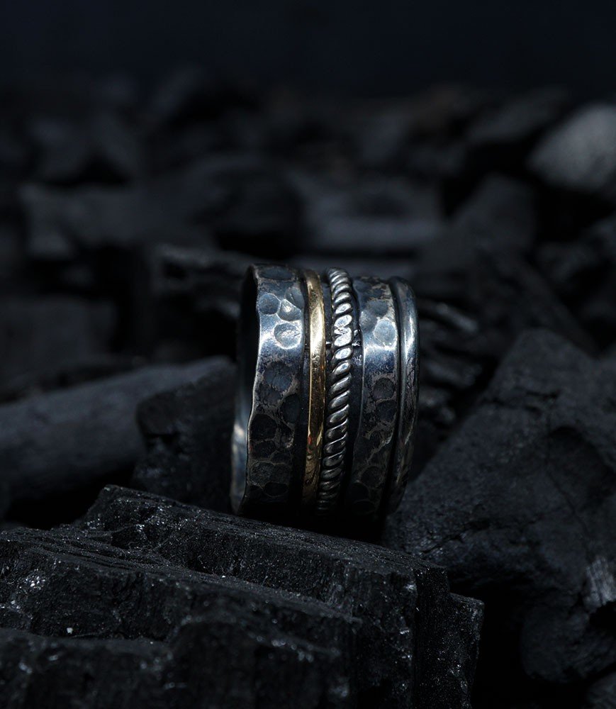 L'argent au titre légal 925/1000 subit un traitement brutal, chacune des pièces (krazy stones) est travaillées à la main, une par une, votre futur bijou forgé unique de par sa forme et ses effets.