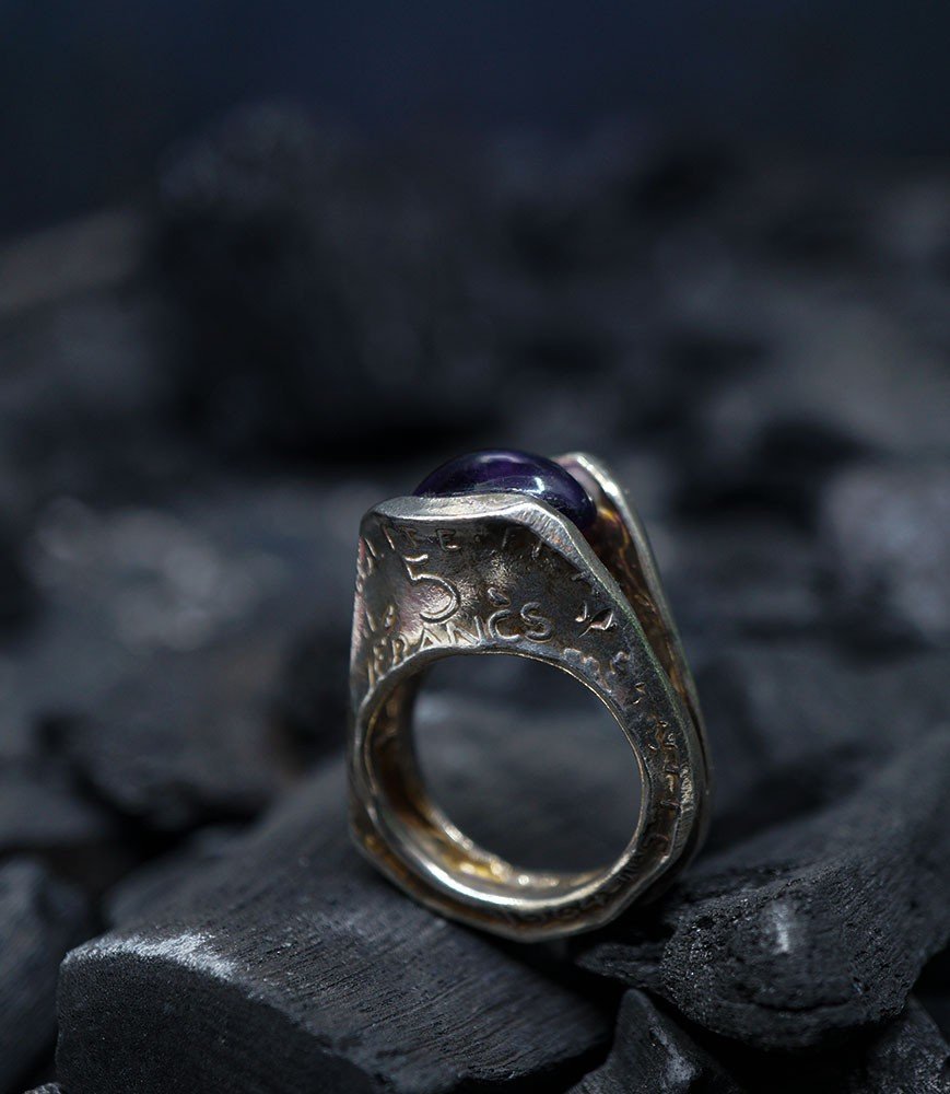 Dans cette collection Krazy Stones, Anthony Barrouyer créé des bijoux à partir de pièces de monnaie françaises "La Semeuse" qui sont en argent.