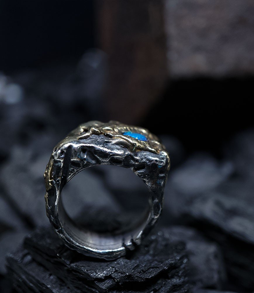Pour la finition l'argent est patiné, vieilli volontairement, l'or contraste par sa brillance, l'effet unique est renforcé par l'esthétique brute de la bague.