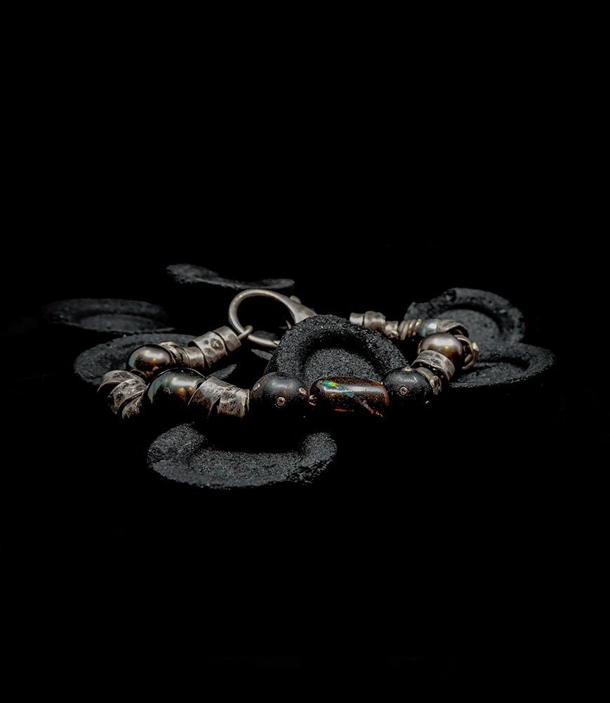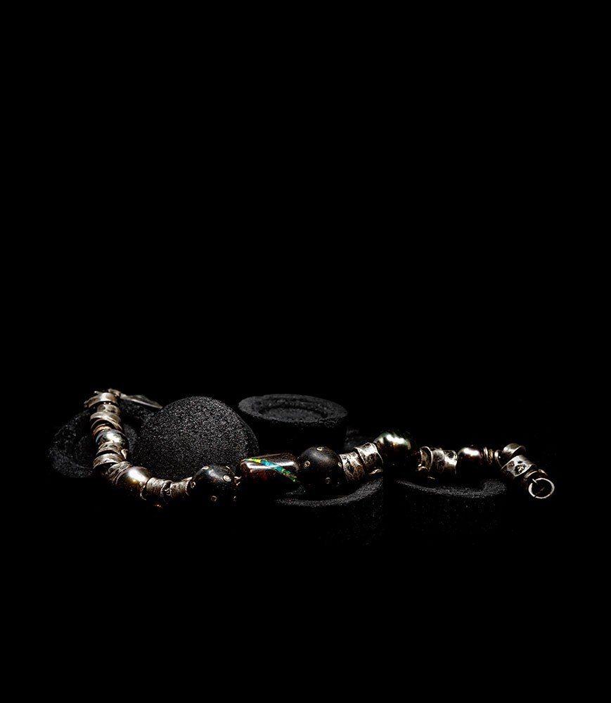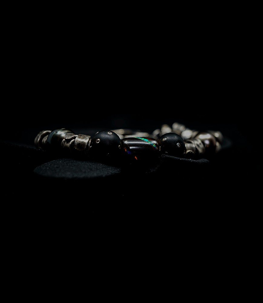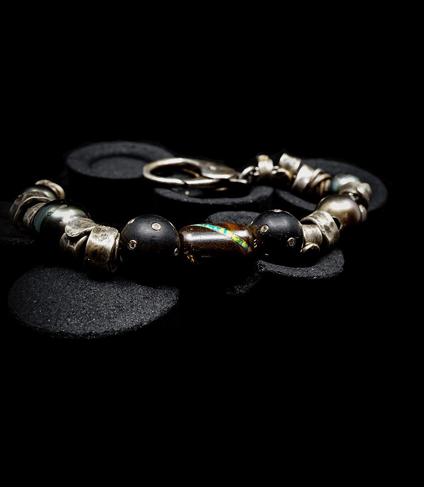 Pesant 46,3 grammes d'argent 925/1000 ce bracelet est composé de quatre perles de Tahiti, de deux perles d'onyx serti de diamants et d'une perle d'opale boulder magnifique.