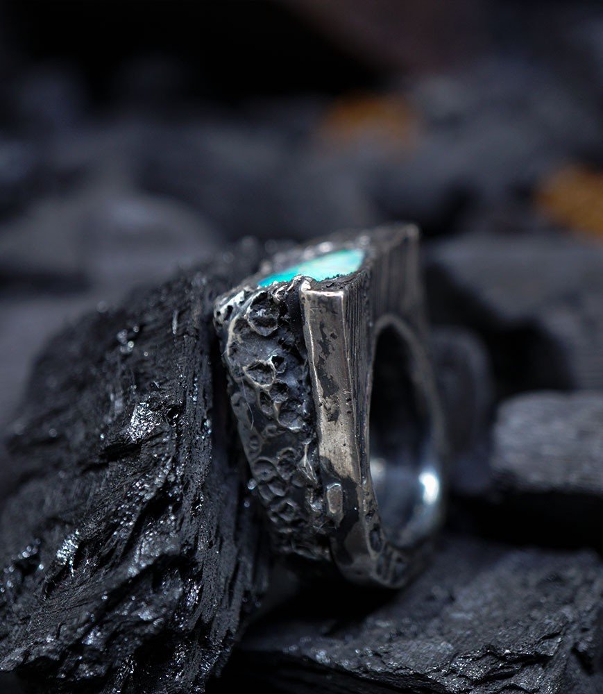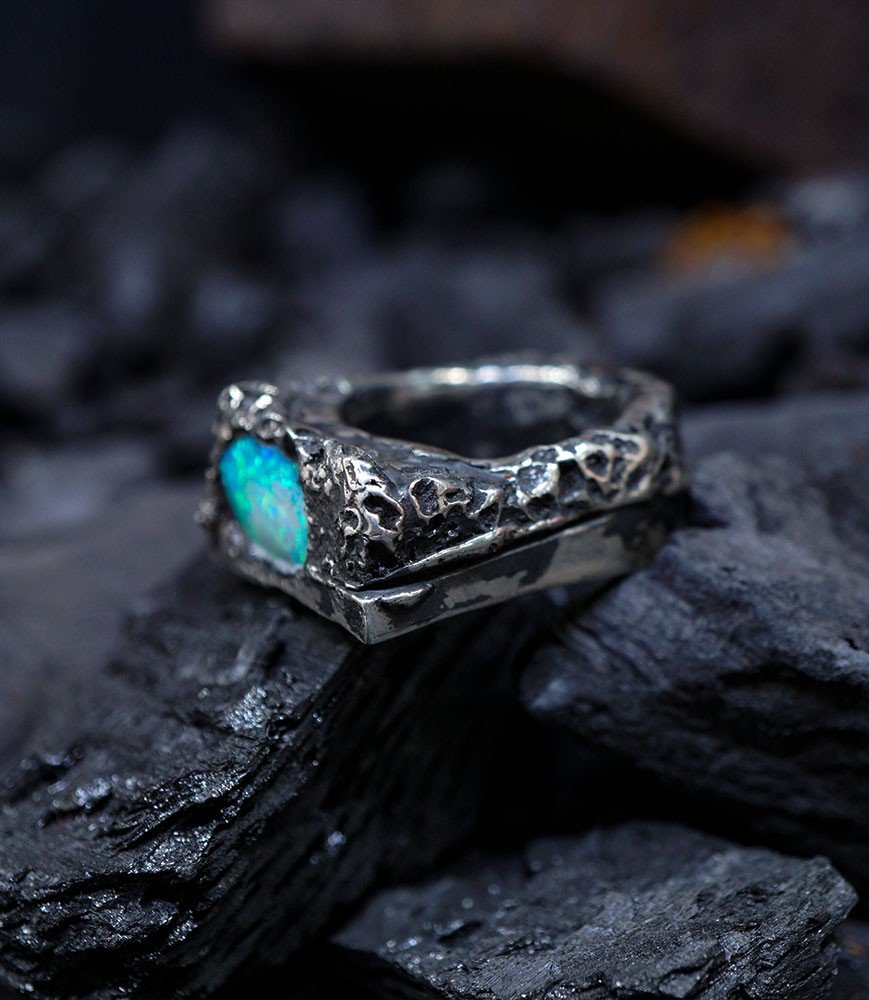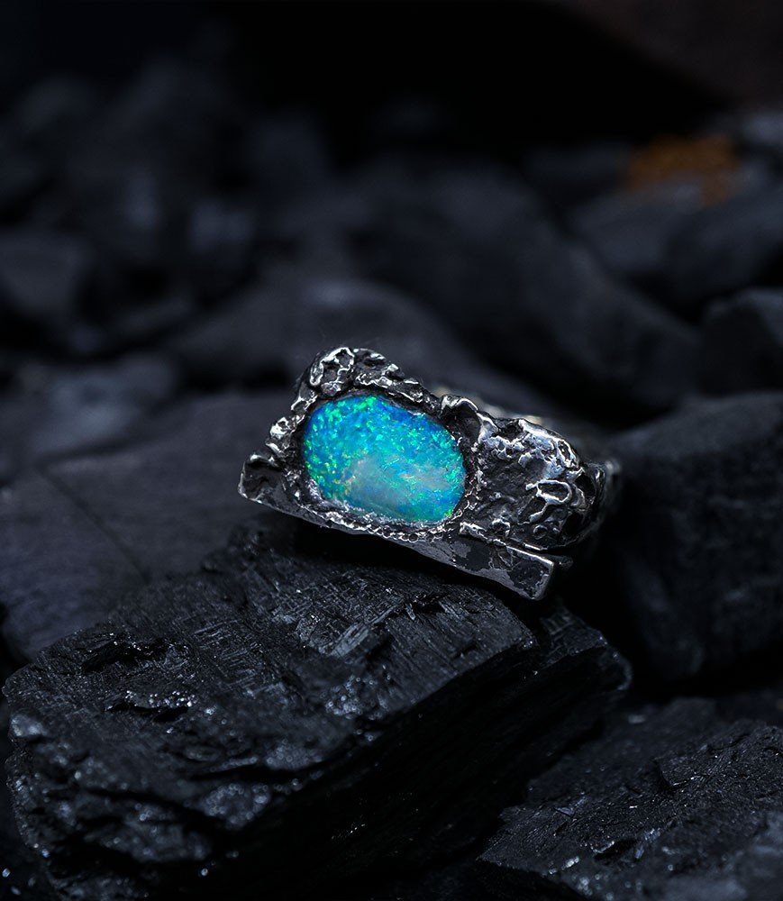 Bague en argent noirci et opale noire Australienne provenant de la célèbre mine Coober Pedy.