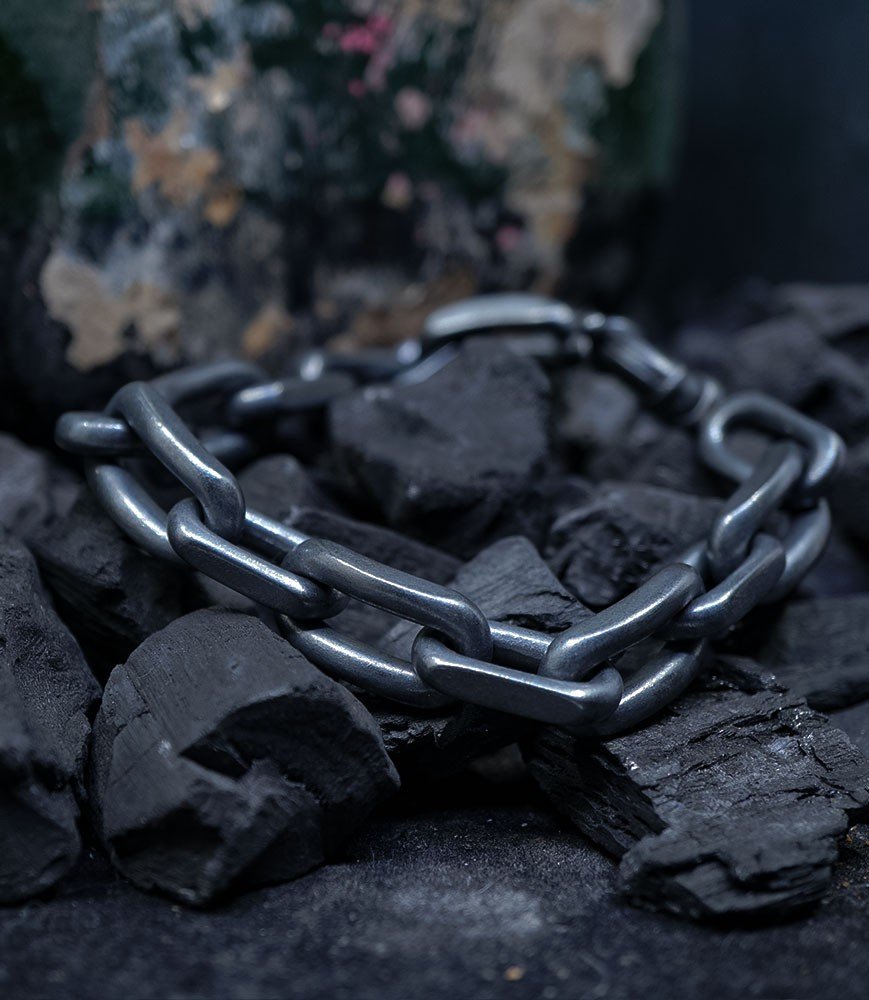 Héphaïstos Collection est un ensemble de modèles très différents mais où la même technique est utilisée pour chaque pièce unique, le travail du métal très marqué et visible, des formes brutes, forgées, une patine noircie, aux aspérités apparentes, des bracelets, des bagues martelés et aussi des colliers.