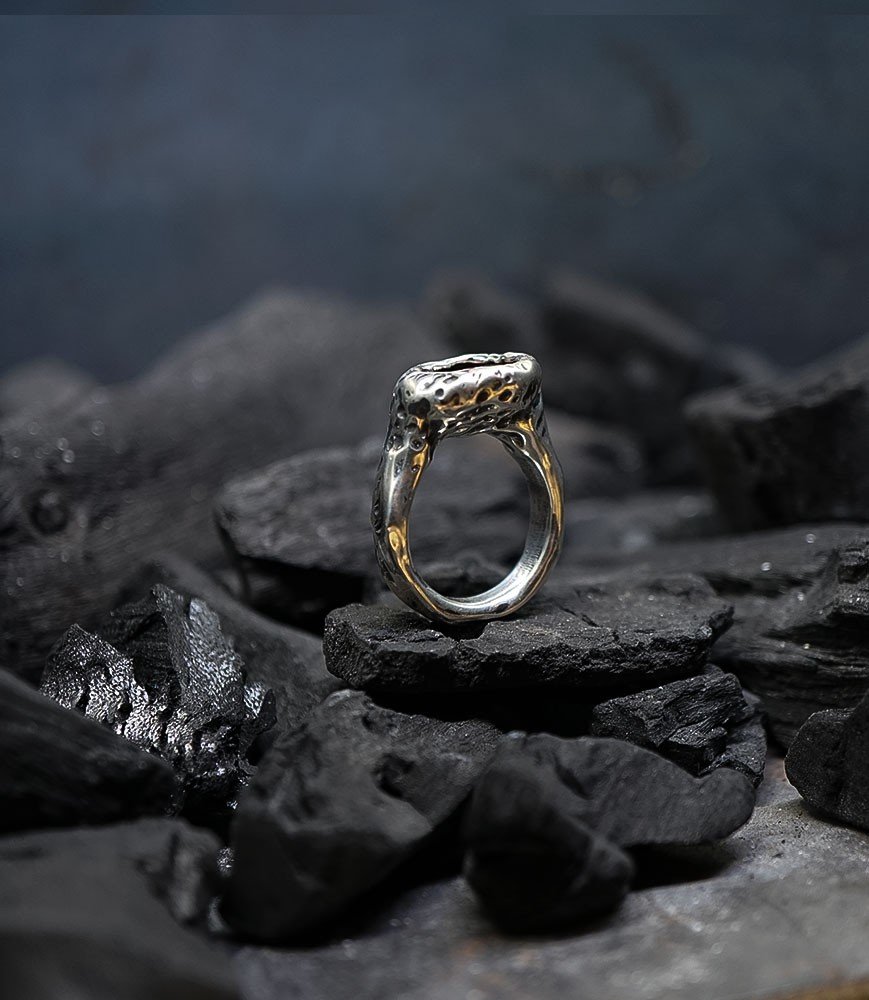 L'argent au titre légal 925/1000 subit un traitement brutal, rude, le résultat après polissage des bagues, bracelets, colliers, bruts, singuliers et harmonieux.