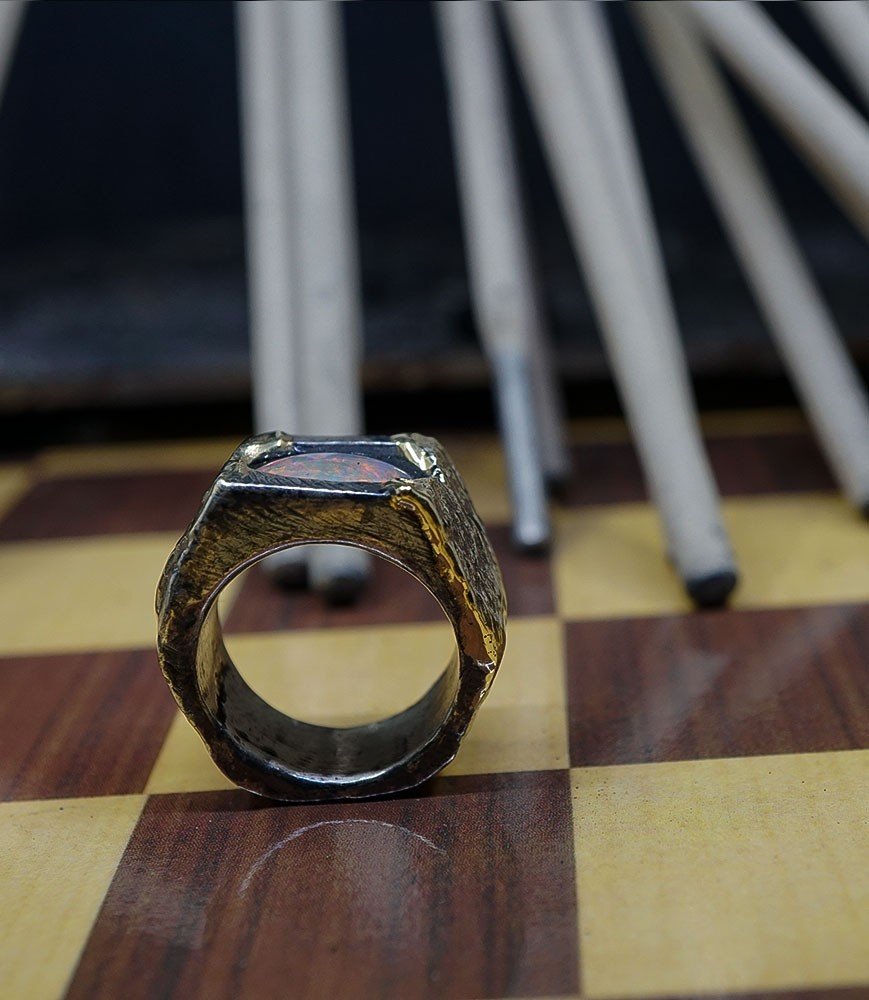 Pour la finition l'argent est patiné, vieilli volontairement, l'or contraste par sa brillance, l'effet unique est renforcé par l'opale et l'esthétique brute de la bague.