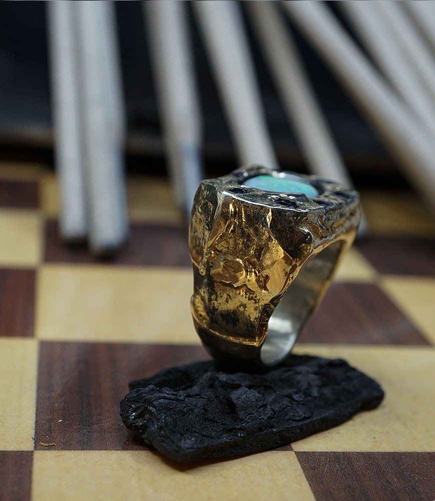 Sertie d'une Opale cette bague en argent massif 925/1000 (22,4 grammes) et Or 750/1000 (9,2 grammes).