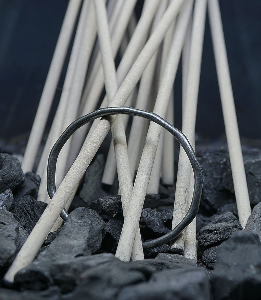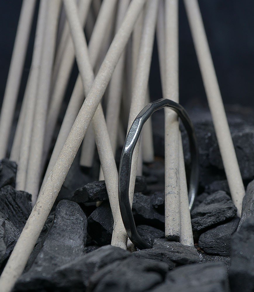 L'argent au titre légal 925/1000 subit un traitement brutal, rude, le résultat après polissage des bagues, bracelets, colliers, bruts, singuliers et harmonieux.