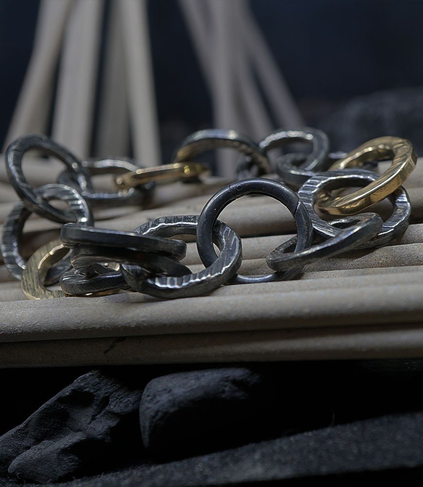Héphaïstos Collection est un ensemble de modèles différents mais où la même technique est utilisée pour chaque pièce unique, le travail du métal très marqué et visible, des formes brutes, forgées, une patine noircie, aux aspérités apparentes, des bracelets, des bagues, triples, larges, martelés et aussi des colliers.