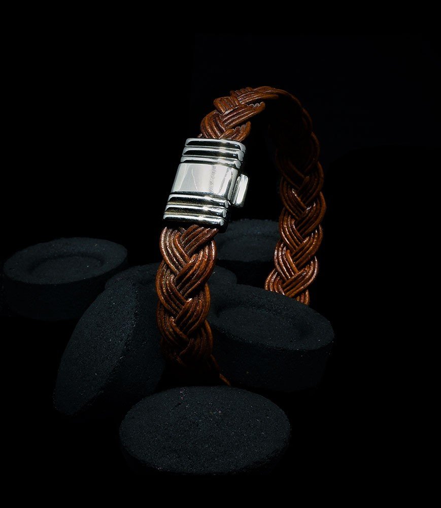 Anthony Barrouyer utilise entre autre le cuir, l'os, la corne, les minéraux associés à l'or au titre légal 750/1000 et l'argent au titre légal 925/1000.