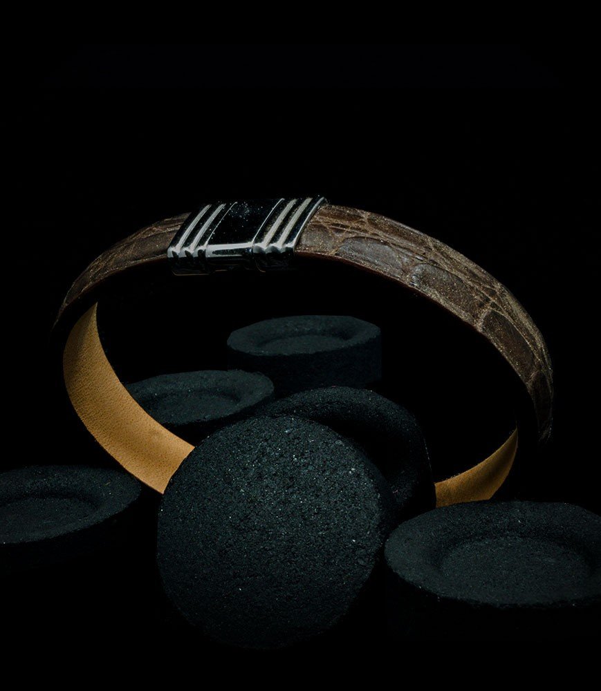 Cette création en cuir d'alligator, teintes marron et ses aspérités réhaussent l'élégance de la pièce.
