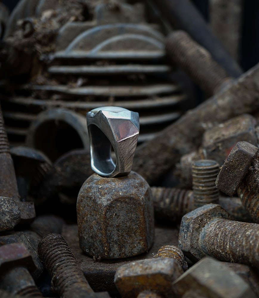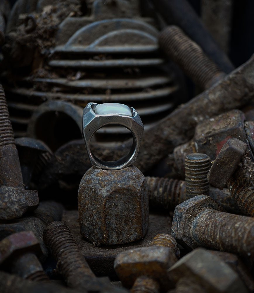 Pour cette bague, il a choisi l'argent massif pour sa noblesse et sa durabilité, et la nacre pour ses reflets changeants et sa délicatesse.