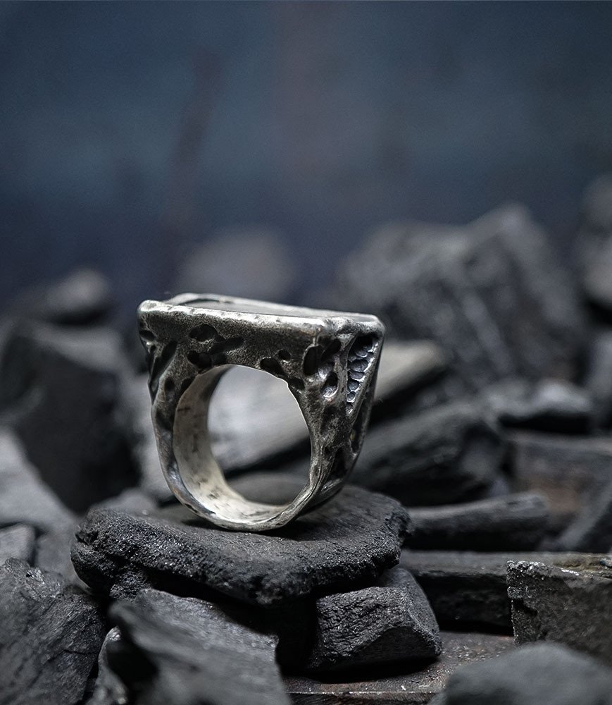 L'argent au titre légal 925/1000 subit un traitement brutal, rude, le résultat après polissage des bagues, bracelets, colliers, bruts, singuliers et harmonieux.