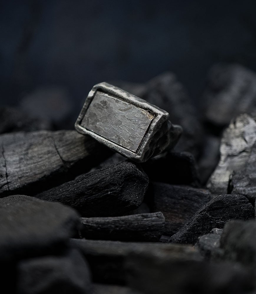 La collection de bagues en argent et météorite représente une fusion remarquable entre l'élégance terrestre et l'éclat céleste.