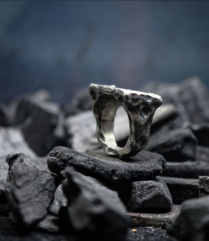 L'argent au titre légal 925/1000 subit un traitement brutal, rude, le résultat après polissage des bagues, bracelets, colliers, bruts, singuliers et harmonieux.