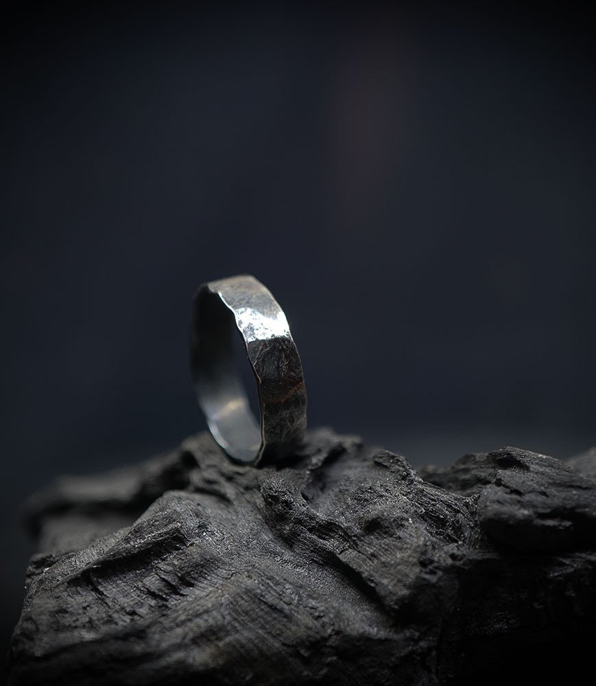 Anneau fin, cette pièce mesure 0,7cm, l'argent est patiné, vieilli renforçant l'effet du martelage.