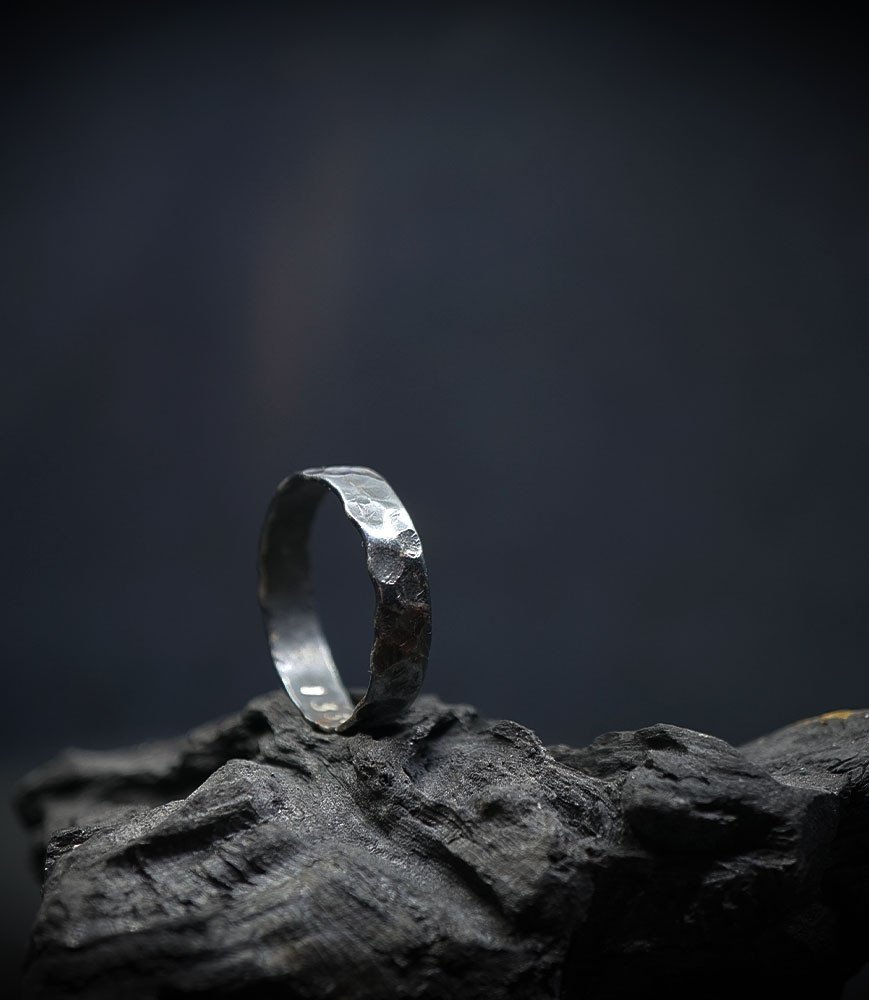 Chaque anneau est unnique la texture martelée ajoute de la profondeur et de la dimension à chaque pièce, créant un contraste avec la simplicité de l'argent.