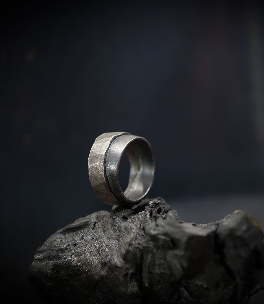 L'argent au titre légal 925/1000 subit un traitement brutal, rude, le résultat après polissage des bagues, bracelets, colliers, bruts, singuliers et harmonieux.