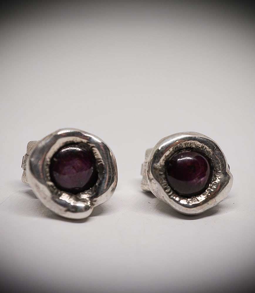 Boucles d'oreilles en argent martelé et rubis étoilés que Valentine a créée est une œuvre d'art magnifique et unique.