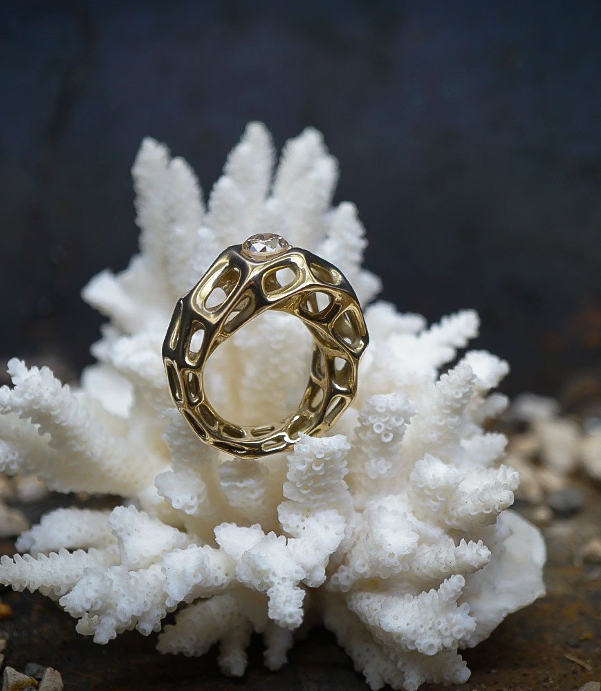 Crafted in 750/1000 gold, it features regular and organic openings that recall natural structures such as coral or honeycombs.