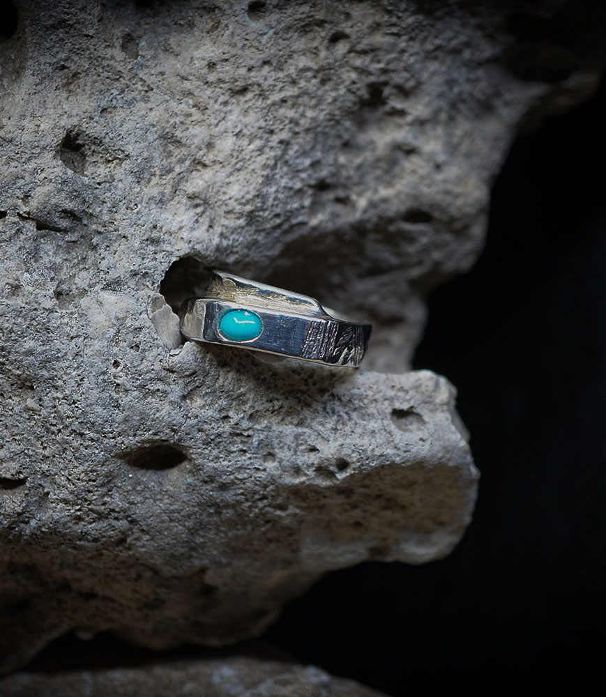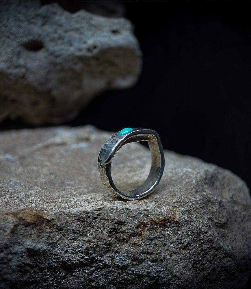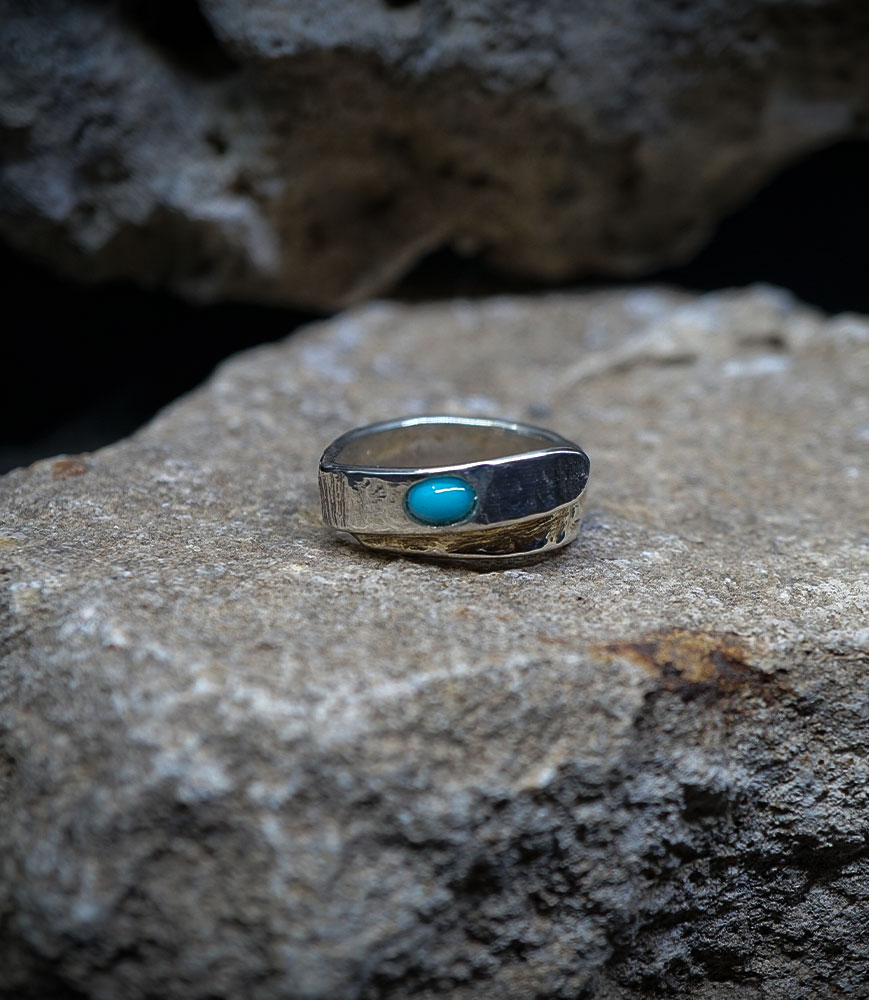 This ring is designed for the free spirit, a modern totem that combines the power of hammered metal with the serenity of the blue stone.
