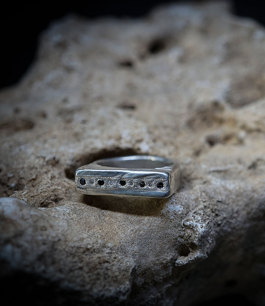 Across this top runs a line of black diamonds, set like a secret inscription—discreet yet absolute. The black of the stones echoes the black of the oxidation, carefully chosen and controlled, which etches the striations and hammered reliefs of the 925 sterling silver. This is not a patina of time—it is an artist's decision.