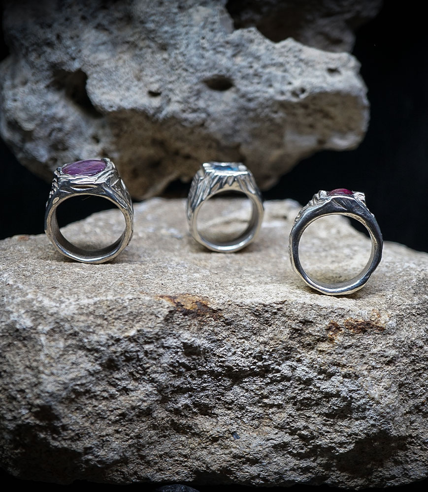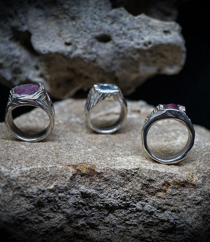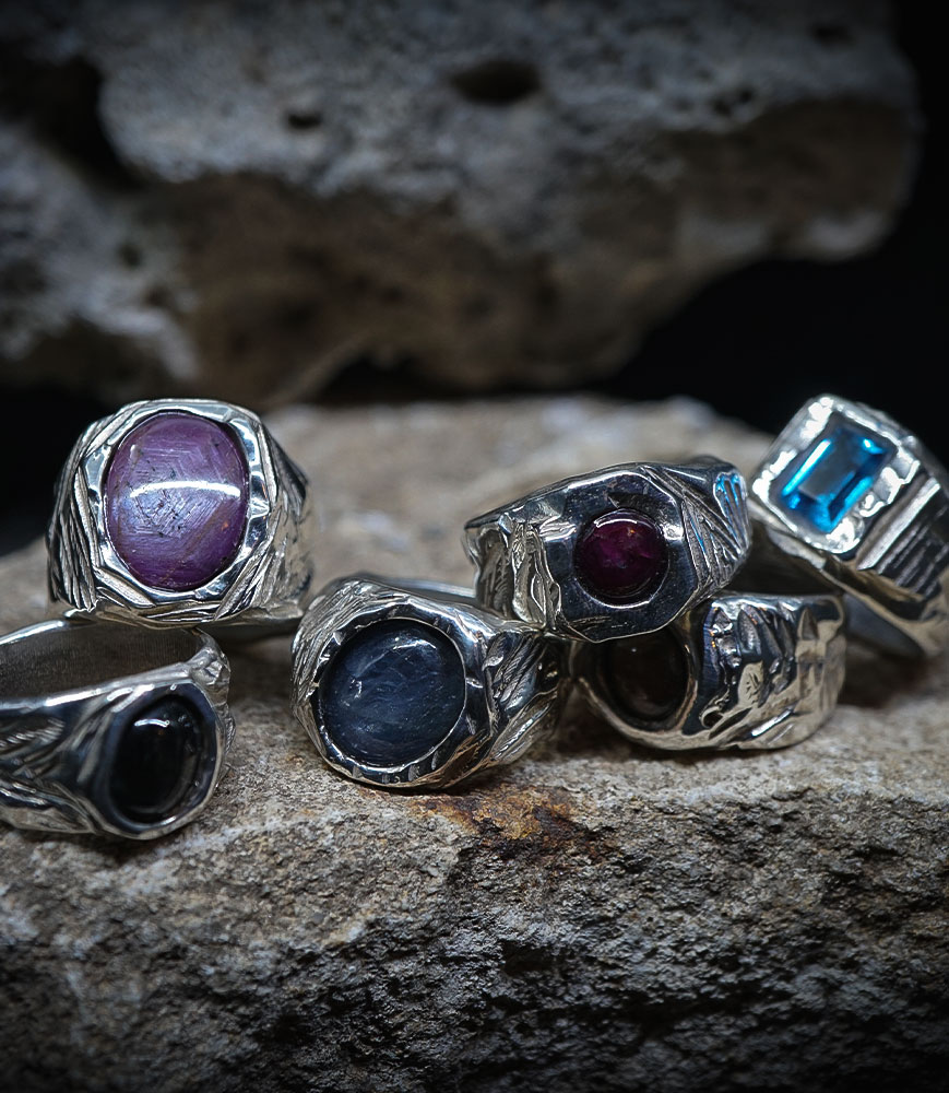"Veins of the Earth" – Collection of Brutal Signet Rings in Solid Silver and Precious Stones