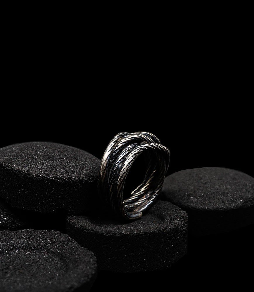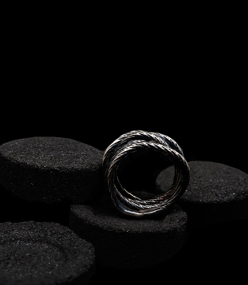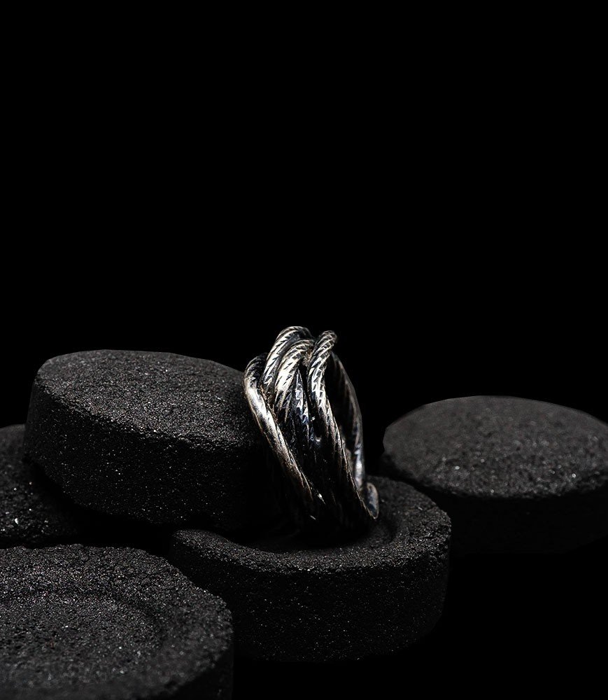 Héphaïstos Collection is a set of different models but where the same technique is used for each unique piece, rings with very marked and visible metal work, raw, forged shapes, a blackened patina, with apparent roughness, double, triple, wide, hammered rings, a return to the first work of metal the "forge" style.