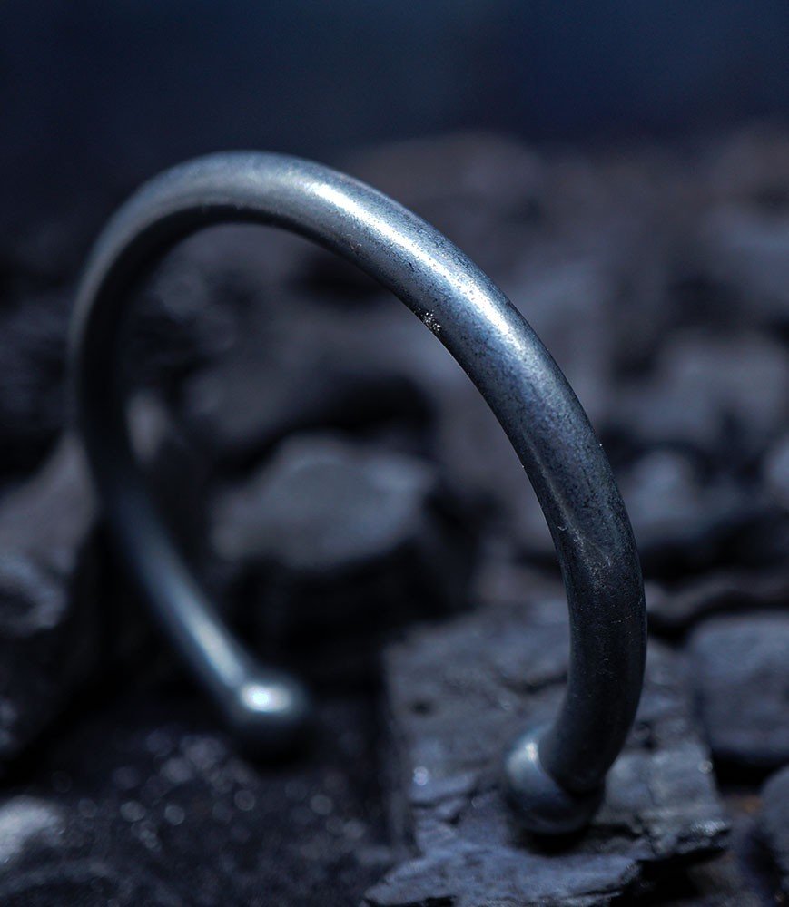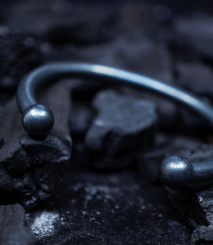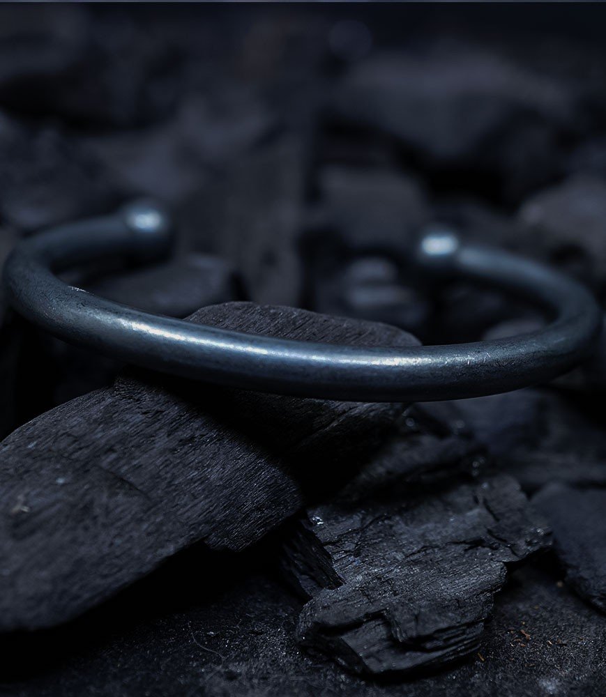 Héphaïstos Collection features very different models, all created using the same technique for each unique piece. The metal work is pronounced and visible, with raw, forged shapes, a darkened patina with visible roughness, including hammered bracelets, rings, and necklaces.